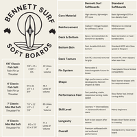 The Bennett Surf Soft Surfboard combines premium soft-top construction with true performance shaping. Built with a lightweight high-density EPS core, carbon T-stinger reinforcement, epoxy-laminated shell and a fast, durable ASA bottom, this board delivers speed, stability and long-lasting strength. Finished with a textured PE deck and equipped with removable Future fin boxes, it’s designed for beginners through to experienced surfers who want safety without sacrificing performance. The all-new Bennett Surf Soft Surfboard range delivers premium construction and true surfboard performance in a safe, soft-top package. Whether you're chasing your first wave or adding a reliable soft board to your quiver, these boards are tuned by our experienced Bennett shapers and trusted by our riders. These boards are designed for all ages in mind.